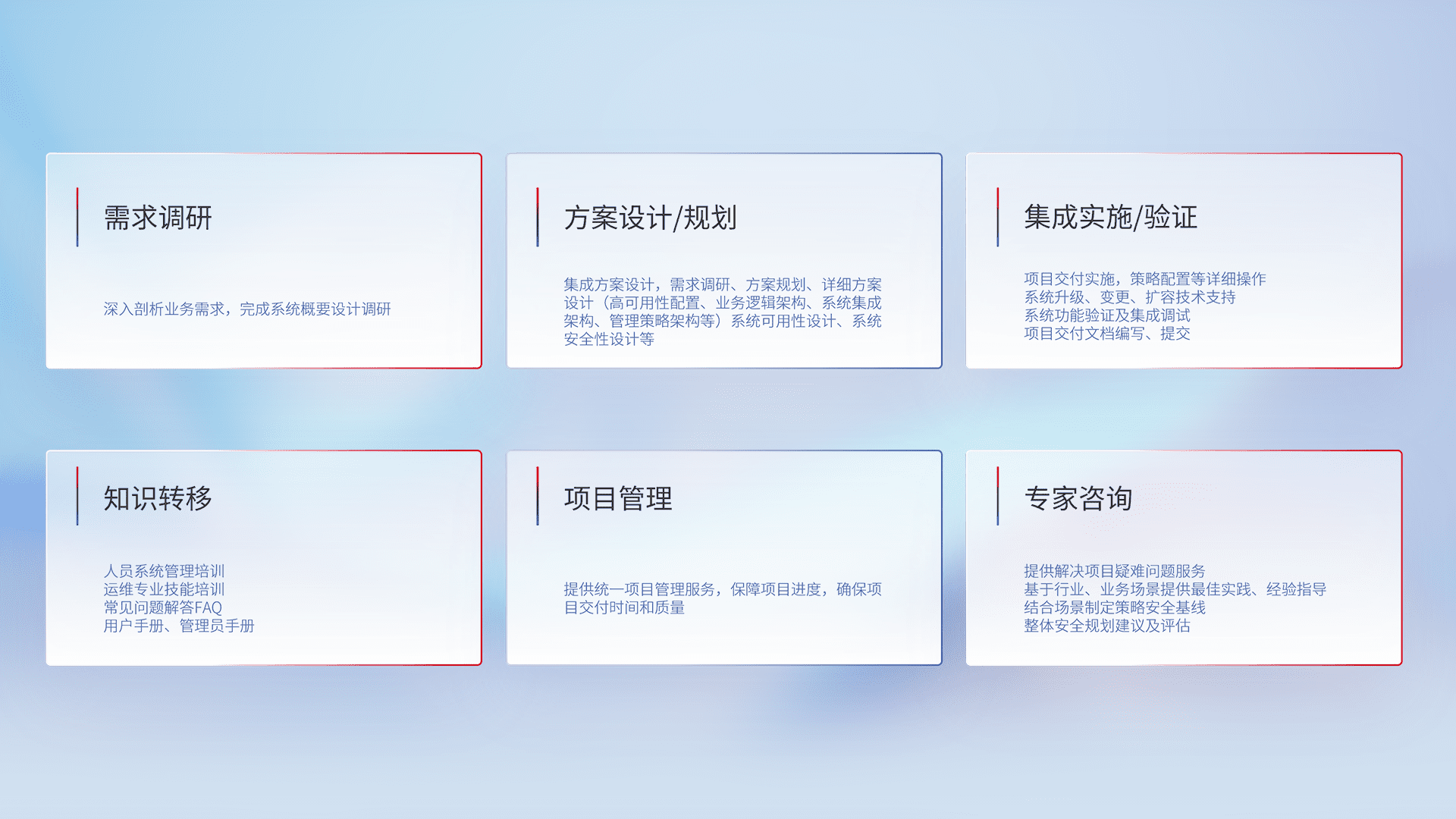 针对客户行业特性,,将宏观的安全战略和需求,,通过专业的交付服务,,实现项目落地,,为客户提供标准规范的集成交付服务。。。。